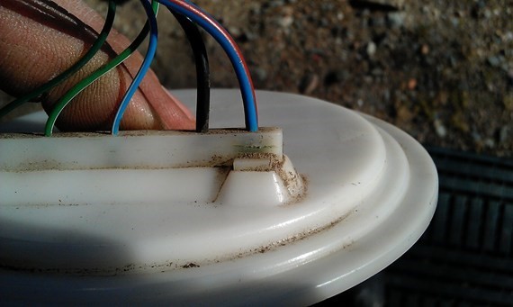 Röd/Blå sladd är matningen till soppapumpen. Man ser en spricka i plasten och att den har ärgat. Köpte en ny tankgivare och bilen funkar som den ska nu.