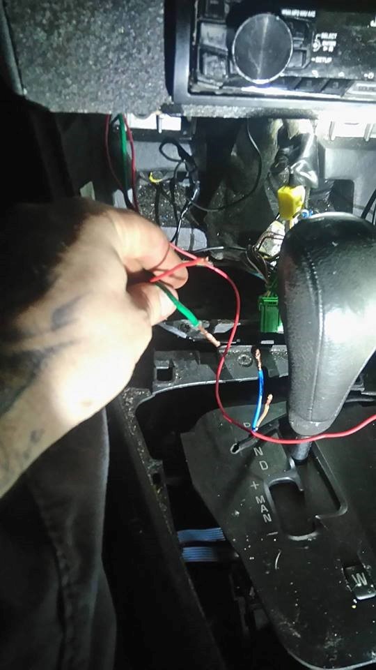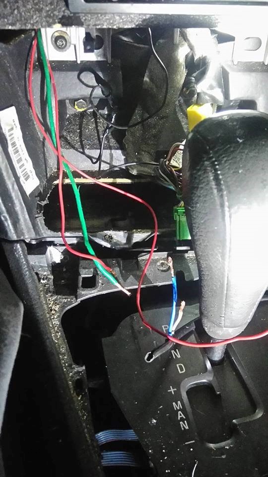 Den bruna och blå går in under växelspaken. Jag såg till att koppla ihop dem igen - blå till blå och brun till brun, då de såg ut att vara av. Troligen något med växelväljaren, kanske? Det bör i och för sig inte ha något med ac-panelen att göra. Däremot är jag rätt fundersam på vad den gröna och röda kabeln är till - de som hänger löst och kommer "uppifrån", liksom från "bakom stereon".