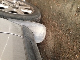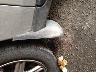 Det är säkert väldigt bekant för många att de stänkskydd i plast som Volvo erbjuder till S60/V70N sitter väldigt lågt. Jag tycker att det ser ut som om det inte finns mer än 5 cm till marken och mina är helt korrekt monterade. Den ena hade ramlat av innan köpet förmodligen av allt skrapande, men det var bara att nita fast igen. Mina tar i nästan alla gupp och gatstenar och jag smyger över dem så gott det går. Stänkskydden bak är ju inte likadana utan där finns det mer spelrum.
