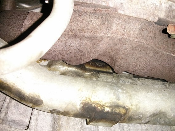Har börjat höra något ljud som låter som att det läcker avgaser långt fram, misstänker grenrörspackningen. Det låter inget när motorn är kall utan börjar först efter att jag har kört motorn varm. Då låter det när man gasar och vid motorbromsande. Har försökt att leta efter några synliga ställen där det verkar ha läckt efter avgasröret hela vägen och hittar inget. Fast på undersidan av grenröret hittade jag något som ser ut som att det läckt avgaser där. Här är en bild på det: