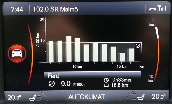 js1 skrev:Jag är hittills väldigt nöjd med min förbrukning. Följande körcykel är från i morse i stadstrafik. Startade i Limhamn, körde via Centralen vidare ut till Fosie Ind By. Halva sträckan med tre personer och en stor hund i bilen, andra halvan ensam med hunden. Mycket rödljus och fyrvägsstopp. Bilen är en V70 T4 med PS.