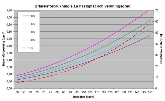 De heldragna linjerna är exempel på förbrukningar (vänstra y-axeln) man får vid olika verkningsgrader på motorn. Verkningsgraden anges som regel i procent. Den streckade linjen är effektbehovet - baserat på luft och rullmotstånd. Den streckade linjen skall man avläsa mot den högra y-axeln.