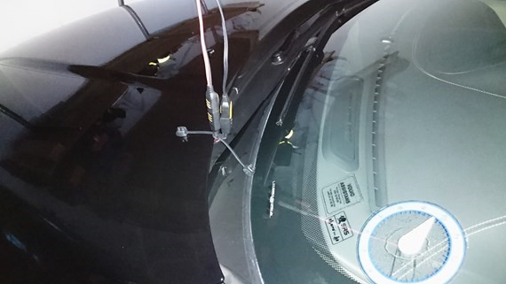 Dra sedan upp kabeln genom gallret till vänster om vänstra torkarna du får göra lite åverkan på gallret, men slipper öppna huven vid laddning