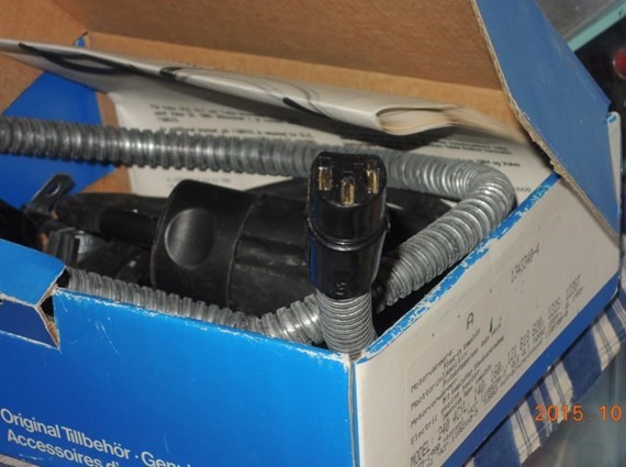 Den svarta med stora kontakthuset passar till äldre Volvo. Det är en sådan i Volvokartongen på den ena bilden. Den med rött skyddslock passar till nyare Volvo, men är märkt Calix. Någon med en Calix originalmotorvärmare får gärna bekräfta om det är samma kontakt. Den gröna kabeln passar till Defa. Detta är alltså anslutningskablarna mellan bilen och uttaget på väggen/stolpen. Grenkablarna i motorrummet är vi fortfarande osäkra på. Det får TS Bohrax reda ut.