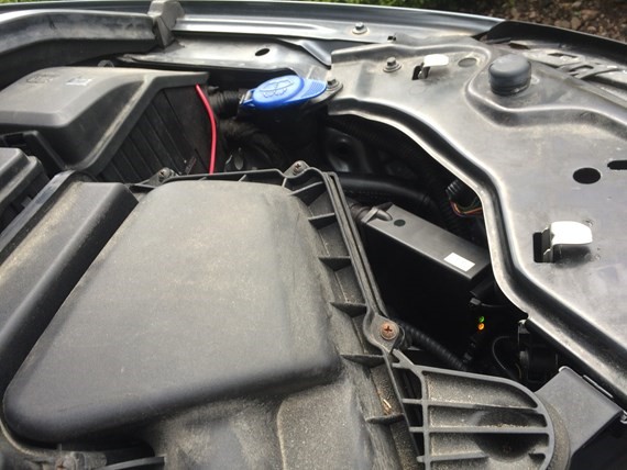 I med skarvkabeln och tillbaka med låsclipset. Kabeln drogs sedan förbi batterilådan till spolarvätskepåfyllningen.