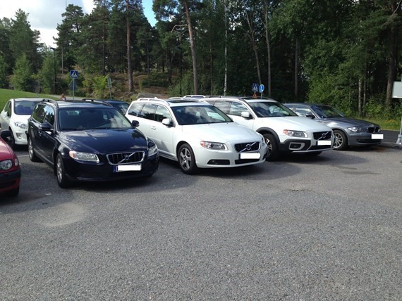 När jag återvände till parkeringsplatsen vid tretiden möts jag av en ljuv syn. Där står 5 volvos intill varandra med nosen utåt. Förutom redan nämnda XC70-13, V70-08 och min V70-12 har en svart R-design V70-12 och en till synes sprillans röd V70-14 anlänt-alla med nosen ut. Där står alla på rad och glänser.