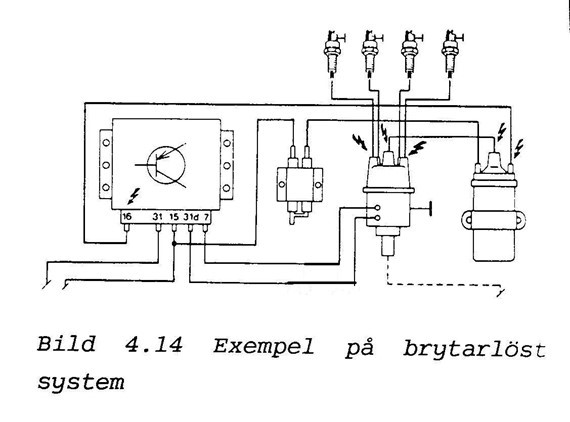 Bilden är något lite missvisande. Den visar två förkopplingsmotstånd. Det var V6-motorerna som hade det. Men man har bara ritat fyra tändstift! :shock: :shock: En fyrcylindrig motor skall bara ha ett förkopplingsmotstånd. Om du köper något sådant som bildexemplet visar, så se till att du får med allt. Tändbox, fördelare, kablar med kontakter och förkopplingsmotstånd. Eventuellt ingår det ett relä där också? Och du bör helst också ta med tändspolen.